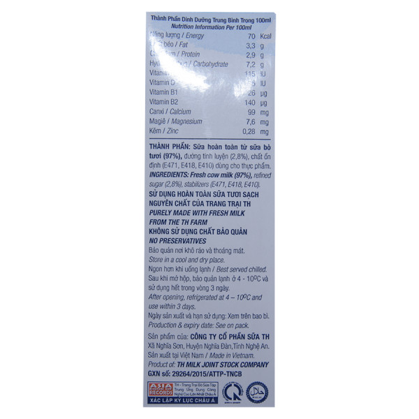 10. Thông tin khác:Sữa Tươi Tiệt Trùng TH True Milk Ít Đường Hộp Giấy 1L là một sản phẩm của thương hiệu sữa sạch TH True Milk được đông đảo người tiêu dùng tin tưởng và lựa chọn. Đây là thương hiệu sữa có trang trại bò hiện đại. Với quy trình sản xuất sữa sạch, TH True Milk có đội ngũ chuyên gia từ Israel tư vấn và theo dõi cách chăm sóc bò đạt tiêu chuẩn, công nhân tham gia quản lý quy trình được đào tạo nghiêm ngặt trước khi vào lao động trong trang trại.