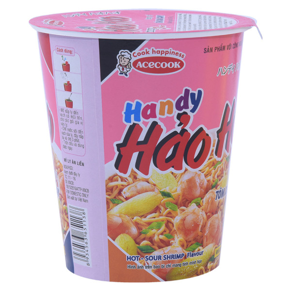 - Mì Ly Hảo Hảo Handy Hương Vị Tôm Chua Cay được làm từ những nguyên liệu chọn lọc, tạo nên sợi mì dai, bóng mượt và nước súp thơm ngon, hấp dẫn, sẵn sàng phụ vụ nhu cầu ăn uống của bạn mọi lúc mọi nơi, dù đang ở nhà, văn phòng, trường học hay tận hưởng những chuyến du lịch xa nhà.